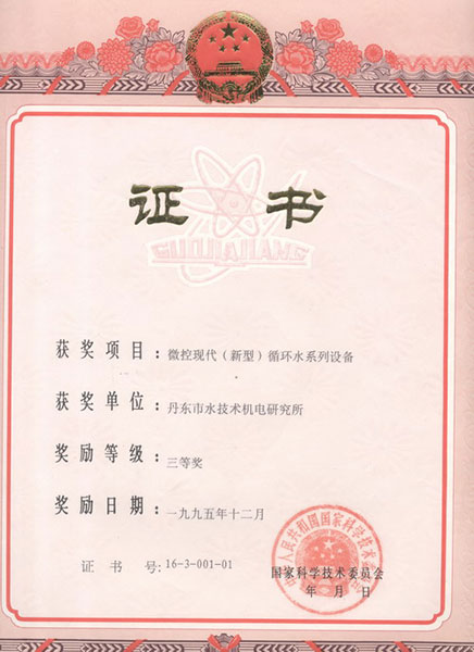 微控循環(huán)水國家科技進步三等獎證書